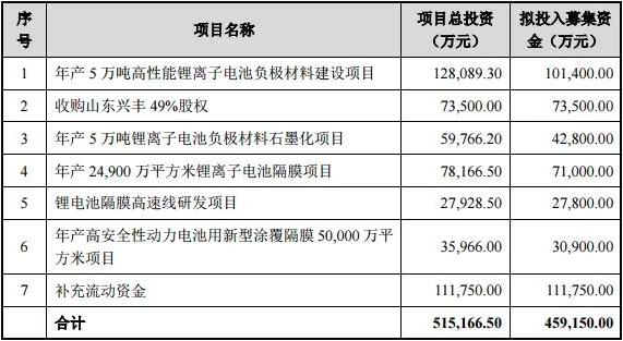 日前,璞泰來發(fā)布公告擬募集資金不超過45.9億元,扣除發(fā)行費(fèi)用后將投資于年產(chǎn)5萬噸高性能鋰離子電池負(fù)極材料建設(shè)項目、收購山東興豐49%股權(quán)、年產(chǎn)5萬噸鋰離子電池負(fù)極材料石墨化項目、年產(chǎn)24,900萬平方米鋰離子電池隔膜項目、鋰電池隔膜高速線研發(fā)項目、年產(chǎn)高安全性動力電池用新型涂覆隔膜50,000萬平方米項目和補(bǔ)充流動資金。