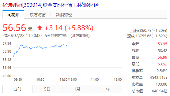 截至7月22日上午收盤,億緯鋰能股價大漲5.88%,報56.56元,總市值達1040億元。