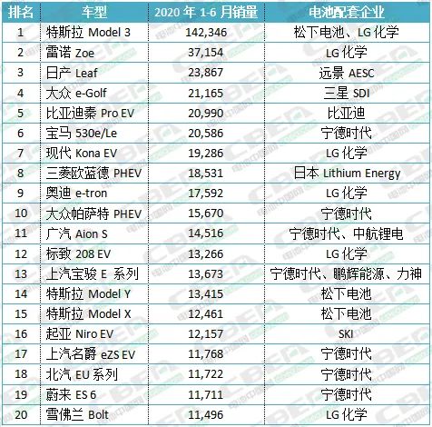 近日,EV Sales發布數據顯示,今年1-6月全球電動汽車銷量達950,076 輛,同比下跌16%,受新冠肺炎疫情影響,全球電動汽車銷量出現了一定程度的下滑。不過與國內新能源汽車上半年銷量下滑37.4%的幅度相比,全球電動汽車整體形勢相對較好。這同時也說明了中國以外的歐美市場,電動汽車正在快速起量。值得注意的是,盡管受到疫情、經濟下滑等波及,仍然有不少電動車型在上半年取得良好表現,銷量大增。而受益于這些電動車型銷量的帶動,相關配套電池生產企業的動力電池裝機量也“水漲船高”,全球動力電池裝機量座次也被更改。現在我們要通過梳理上半年熱銷的車型,一窺這背后配套的電池生產企業情況,了解全球電池市場的變動。