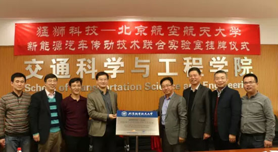 2016年3月11日下午,廣東猛獅新能源科技股份有限公司(以下簡稱“猛獅科技”)與北京航空航天大學交通科學與工程學院(以下簡稱“北航交通學院”)聯合成立的新能源汽車傳動技術聯合實驗室在北京航空航天大學工程訓練中心舉行了掛牌儀式。