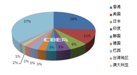 香港是我國電池行業(yè)最大的轉口貿易地,2013年我國內地向香港地區(qū)的出口金額達到了25.33億美元,占2013年中國電池總出口額的26.4%。