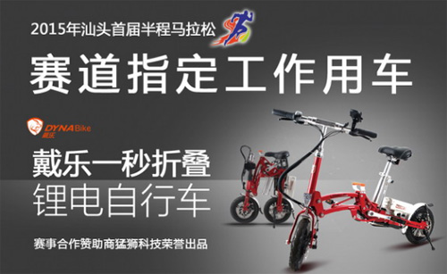 作為“2015年汕頭半程馬拉松賽”賽事合作贊助商,猛獅科技旗下的戴樂一秒折疊鋰電自行車成為“賽道指定工作用車”,而這款車也是猛獅科技踐行“綠色健康生活主張”的一款時尚產品。