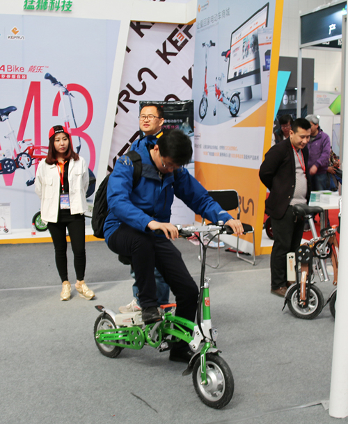 圖為展會(huì)現(xiàn)場(chǎng),觀眾試騎M3鎂合金智能折疊電動(dòng)自行車