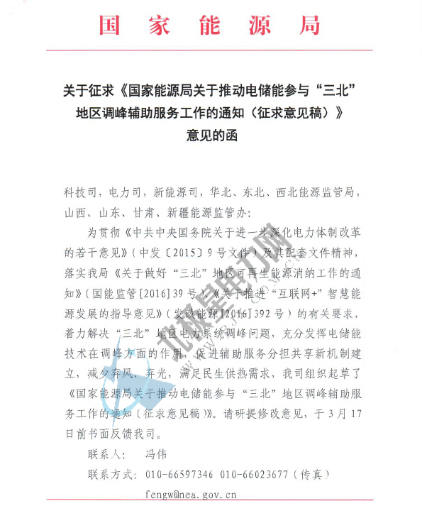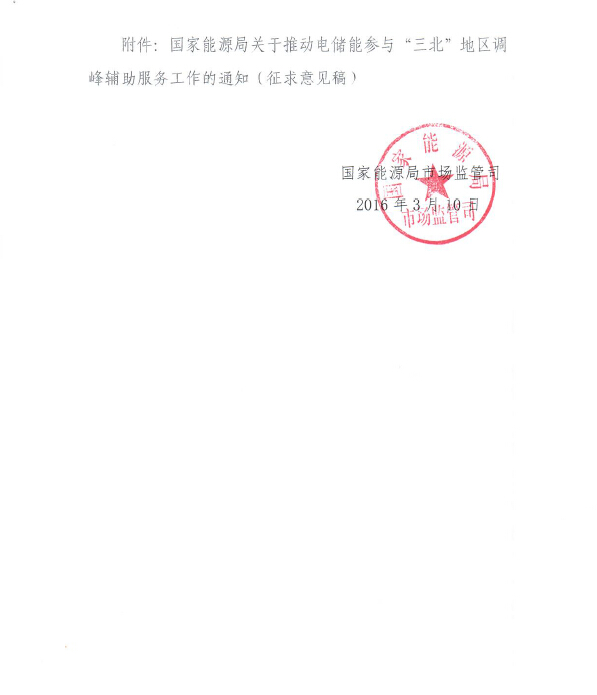 近日記者獲悉,為貫徹《中共中央國務(wù)院關(guān)于進(jìn)一步深化電力體制改革的諾干意見》及其配套文件精神,落實國家能源局《關(guān)于做好“三北”地區(qū)可再生能源消納工作的通知》、《關(guān)于推進(jìn)“互聯(lián)網(wǎng)+”智慧能源發(fā)展的指導(dǎo)意見》的有關(guān)要求,著力解決“三北”地區(qū)電力系統(tǒng)調(diào)峰問題,充分發(fā)揮電儲能技術(shù)在調(diào)峰方面的作用,減少棄風(fēng)、棄光,滿足民生供熱需求,能源局市場監(jiān)管司起草了《國家能源局關(guān)于電儲能參與“三北”地區(qū)調(diào)峰輔助服務(wù)工作的通知(征求意見稿)》。