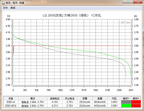 再對比一下LG 2600和力神2600的1C(2.6A)放電曲線。可以發現,力神2600的放電性能完全不遜色于LG 2600mAh 18650,甚至還顯著高于LG 2600。得益于力神的電壓平臺更高,雖然都是2600mAh,但能量明顯要高于LG。