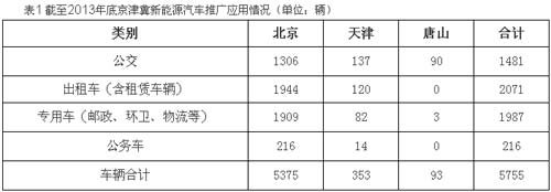 2009-2013年,北京市、天津市、唐山市被列入國家“十城千輛”節能與新能源汽車示范推廣試點城市,截至2013年底,三個城市在公交等公共服務領域共推廣新能源汽車共計5755輛,分別為:北京市5375輛、天津市353輛、唐山市93輛。應用領域包括公交、出租、租賃、環衛、郵政、物流等。經過幾年運行,京津冀地區累計減排二氧化碳近10萬噸,節約燃油超過3萬噸,節能減排取得一定成效。