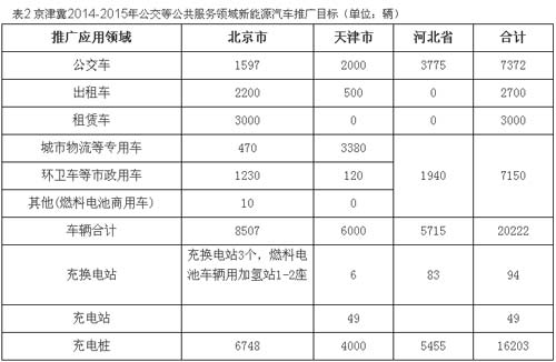2014年至2015年,在京津冀地區公共交通服務領域共推廣20222輛新能源汽車。其中北京市8507輛,天津市6000輛,河北省5715輛,到2015年底,京津冀地區公交車中新能源汽車比例不低于16%,京、津出租車中新能源汽車比例不低于5%,河北省繼續做好示范城市新能源汽車的推廣應用工作,新能源汽車在公交及公共服務領域的應用水平國內領先。