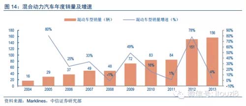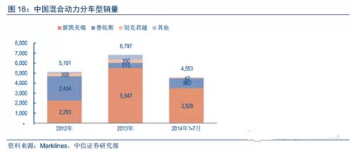 目前中國在售混合動力車型主要是豐田的凱美瑞(混動版)和普銳斯,長安、吉利等自主產品有望逐步跟進。2013年凱美瑞(混動版)、普銳斯分別銷售5547輛、513輛。自主品牌方面,長安汽車、吉利汽車的混合動力車型有望今年四季度上市,逐步跟進。