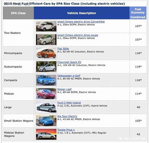 最近,EPA公布了2015年度能效最高的車型榜,毫無(wú)懸念,這個(gè)榜單基本上被電動(dòng)車所壟斷,一共8個(gè)級(jí)別9個(gè)冠軍車型中,6個(gè)是電動(dòng)車,另兩個(gè)是混合動(dòng)力車(詳見(jiàn)上圖)。
