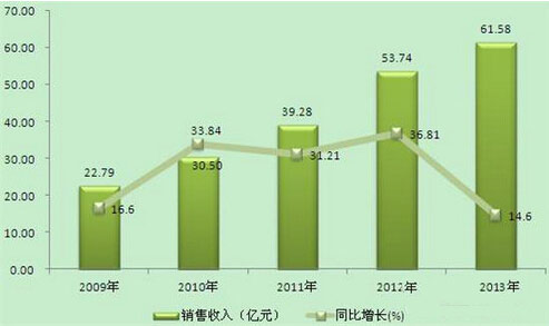 根據前瞻產業研究院發布的《2015-2020年中國薄膜電容器行業市場前瞻與投資規劃分析報告》數據顯示,據統計,截至2007年我國已是世界最大的BOPP電容膜制造國,約占全球產量的50%左右,年需求量約4.4萬噸。近年來國內電容膜產量不斷增長,"十一五"期間國內電容器用聚丙烯電子薄膜的復合增長率超過15%。2013年,我國薄膜電容器行業市場規模達到61.58億元,同比增長14.6%。