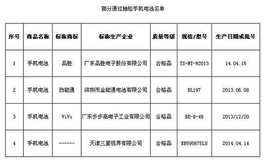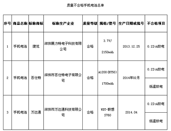 抽檢中發現,標稱深圳展力特電子科技有限公司生產的一批次“捷優” 手機電池被檢出0.2ItA放電項目不合格;標稱深圳市百仕特電子有限公司生產的一批次“百仕特” 手機電池、標稱深圳市萬達通科技有限公司生產的一批次“萬達通” 手機電池被檢出0.2ItA放電、低溫放電項目不合格。