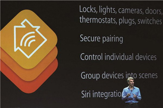 △ 蘋果智能家居。2014年6月,蘋果公司宣稱,最新設計的“HomeKit”智能家居平臺可實現通過智能手機遠程控制,同時,該平臺支持的產品線更為廣泛,例如:燈、門、溫度調節裝置、開關。