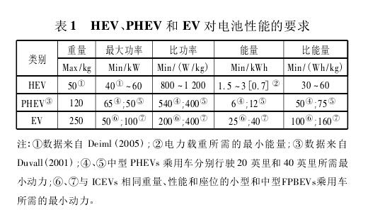 由于不同類型新能源汽車中,車用動力電池的使用方式有較大區(qū)別,因此對于其性能要求有較大區(qū)別。HEV有汽油發(fā)動機作為動力來源,更強調(diào)加速性能和爬坡能力,因此更注重電池的比功率(要求高達800一1 200 W / kg);PHEV和EV完全以電池作為動力,更強調(diào)充電后的續(xù)駛能力,因而更關(guān)注電池的比能量(要求達到100一160 Wh/kg)(見表1)。