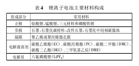 鏗離子動力電池主要由正極材料、負極材料、電解液和電池隔膜4部分組成(見表4)。