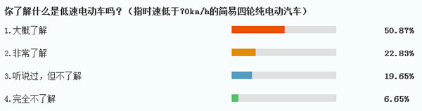 調(diào)查數(shù)據(jù)顯示,在參與網(wǎng)絡(luò)投票的人群中,有50.87%的網(wǎng)友表示對于低速電動車“大概了解”,另有22.83%的網(wǎng)友選擇“非常了解”,占比超過70%,說明低速電動車這類產(chǎn)品在市場上的確擁有很高的關(guān)注度,選擇“完全不了解”這一選項(xiàng)的網(wǎng)友僅占全部調(diào)查人群的6.65%。