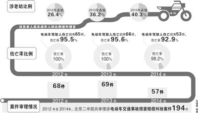 北京二中院分析發(fā)現(xiàn),涉電動車交通事故損害賠償糾紛案件中,涉及老人或未成年人的比例逐年增多:2012年為26.4%,2013年為36.2%,2014年為40.3%。