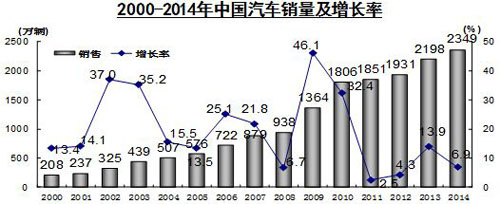 統計顯示,2014年我國汽車產銷2372.29萬輛和2349.19萬輛,同比增長7.26%和6.86%;其中,乘用車產銷1991.98萬輛和1970.06萬輛,同比增長10.15%和9.89%;商用車產銷380.31萬輛和379.13萬輛,同比下降5.69%和6.53%。