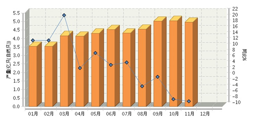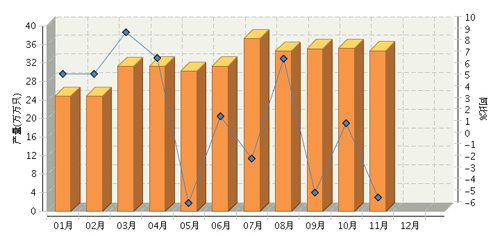2014年1-11月全國鉛酸蓄電池行業(yè)累計(jì)完成產(chǎn)量同比增長6.74%。其中:11月份完成產(chǎn)量同比增長-2.76%。