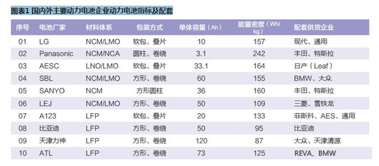 目前量產的鋰離子動力電池產品能量密度普遍偏低。國外以日本、韓國的企業(yè)為例,普遍采用層狀鎳鈷錳三元+尖晶石錳酸鋰體系正極材料,單體電池能量密度約160Wh/kg;而國內普遍采用橄欖石型磷酸鐵鋰為正極材料,單體電池能量密度不超過140Wh/kg。動力電池能量密度偏低問題制約了電動汽車的行駛里程,直接阻礙了純電動汽車的市場推廣。國內外主要動力電池企業(yè)已經量產能量型動力電池產品關鍵指標及配套供貨企業(yè)如下: