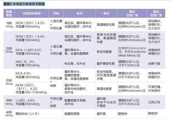 根據2011年NEDO公布消息,日本政府已集合多所大學及企業(yè)進行高能量密度電池的研究,計劃到2020年達到250Wh/kg(可支持電動車行駛300 公里),2030年達到500Wh/kg(可替代傳統(tǒng)燃油汽車的水平)。當前,我國較好的磷酸鐵鋰電池能量密度可以達到 130Wh/kg,能夠支持行駛130公里。高比能正、負極材料開發(fā)是未來動力電池比能量大幅度提升的主要途徑。我國部分電池企業(yè)正進行下一代電池的研發(fā),采用三元材料與改性錳酸鋰等,預計2015年上半年量產動力電池能量密度可達180Wh/kg,不額外增加電池數量情況下可支持續(xù)駛里程達到200公里。技術路線上,按照未來動力電池的能量密度高低來劃分,可分為以下幾類。