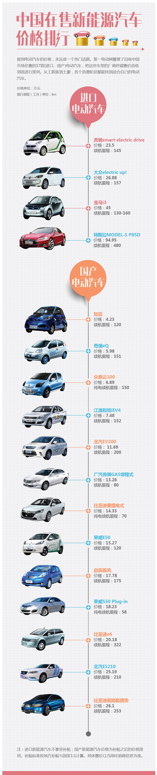 目前中國市場在售的15款(進口、國產)電動汽車,小編把這些車型的廠商建議零售價由低到高進行排列。從工薪族到土豪,各個消費階層都能找到適合自己的電動汽車。