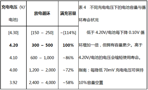 對于循環(huán)壽命來說,鋰離子電池的最佳充電電壓為3.92V。電池專家們相信這個臨界值消除了所有與電壓相關的不利影響,當?shù)陀谠撝禃r,可能會給電池帶來其他的不利影響。表4總結(jié)了不同充電水平下的電池容量狀況,所有數(shù)值均是估值。