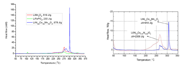 不同的正極材料,其活性物質(zhì)分解所產(chǎn)生的熱量是不同的,所釋放的氧氣含量也有所不同。磷酸鐵鋰正極材料由于分解時產(chǎn)生的熱量較少,因而在所有的正極材料中,熱穩(wěn)定性最為突出。鎳鈷錳三元材料分解時則會產(chǎn)生較多的熱量,同時伴有大量的氧氣釋放,容易產(chǎn)生燃燒或爆炸,因此安全性相對較低。