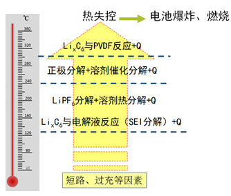 由于電池存儲能量,在能量釋放的過程中,當電池熱量產(chǎn)生和累積速度大于散熱速度時,電池內(nèi)部溫度就會持續(xù)升高。鋰離子電池由高活性的正極材料和有機電解液組成,在受熱條件下非常容易發(fā)生劇烈的化學副反應,這種反應將產(chǎn)生大量的熱,甚至導致的“熱失控”,是引發(fā)電池發(fā)生危險事故的主要原因。