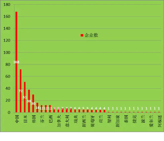 2015年“500強”上榜企業分別來自37個國家和地區,比2014年“500強”多1個國家。其中,中國(中國大陸及香港、澳門、臺灣)有協鑫(集團)控股有限公司、晶龍實業集團有限公司、國電科技環保集團股份有限公司、龍源電力集團股份有限公司、天能集團、阿特斯陽光電力科技有限公司、新疆金風科技股份有限公司等168家企業進入“500強”榜單,比去年(163家)增加5家,占33.6%,居首位;美國有GE Energy、Archer Daniels Midland Company、Dow Corning Corporation、Valero Energy Corporation、Bunge Ltd.、POET LLC、First Solar Inc.、Sunpower Corporation、SunEdison Inc.等72家企業進入“500強”榜單,比去年(74家)少2家,占14.4%,位居第二;日本則有Sanyo Electric Co., Ltd.、Sharp Corporation、Toshiba Corporation、Kyocera Corporation、Solar Frontier K.K.等51家企業進入“500強”榜單,比去年(41家)多10家,占10.2%,排名超過德國升至第三;德國有Siemens AG、Enercon GmbH、E.ON Kraftwerke GmbH、Nordex SE、Juwi Holding AG等38家企業進入“500強”榜單,比去年(48)少10家,占7.6%,退居第四;韓國有OCI Company Ltd.、LG Chem., Ltd. 、SK Group等30家企業進入“500強”榜單,與去年(30家)持平,占5.8%,位居第五;西班牙則有16家,占3.2%,位居第六; 芬蘭、法國、巴西各12家,各占2.4%,并列第七;印度9家,占1.8%,位居第十(見圖1)。
