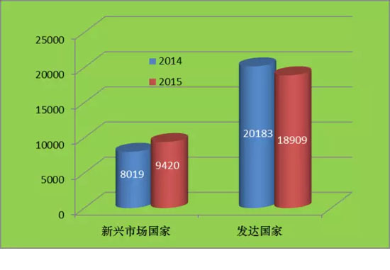 圖4 2014、2015“500強”發達國家與新興市場國家上榜企業總營業收入(單位:億元)