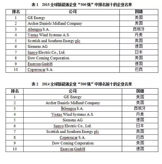 2015“500強”排名前十的企業依次為GE Energy(美國)、Archer Daniels Midland Company(美國)、Abengoa S.A.(西班牙)、Vestas Wind Systems A/S(丹麥)、Scottish and Southern Energy PLC(英國)、Siemens AG(德國)、Sanyo Electric Co., Ltd.(日本)、Dow Corning Corporation(美國)、Enercon GmbH(德國)和Copersucar S.A.(巴西)。連續2年,前十的企業中都出現了新興市場國家企業的身影,而不再是由發達國家企業獨霸。由此可見,新興市場國家企業的競爭力增強,其與發達國家的差距正減少。