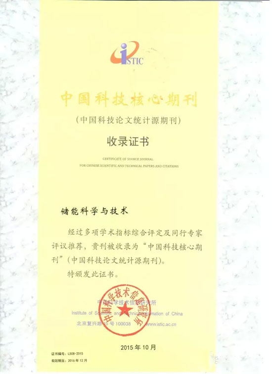 2015年10月21日,由中國科技學技術信息研究所評選的“2015中國科技核心期刊”結果在北京國際會議中心發布,創刊于2012年的《儲能科學與技術》入選“中國科技核心期刊”。丁玉龍主編、馬紫峰副主編(兼中國化工學會儲能工程專委會主任)發來賀信,他們一致認為這對《儲能科學與技術》的發展具有里程碑式的意義。