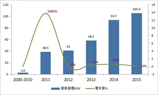 圖3:中國儲能項目累計裝機規模(2000-2015)