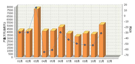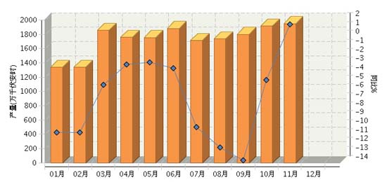 2015年1~11月,全國堿性蓄電池行業(yè)累計完成產(chǎn)量同比增長-29.37%。其中:11月份完成產(chǎn)量同比增長-26.93%。2015年全國堿性蓄電池行業(yè)月度產(chǎn)量及同比如上圖所示。