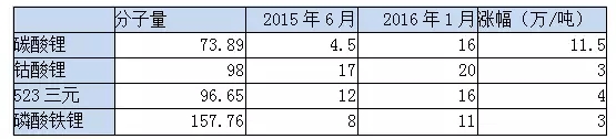 不過,高速增長并沒有讓這兩種材料有價格上有所突破,截止到2015年6月,不僅限于三元和磷鐵,錳酸鋰和鈷酸鋰材料也一直處于穩定的降價通道中,一方面是由于生產工藝的穩定性在提高,一方面是市場供求相對均衡,企業規模擴大所帶來的效益提升明顯,鋰電池產品也受此影響價格一直穩步下探。不過,自2015年下半年開始,在高速增長的市場面前,碳酸鋰企業嗅到了商機,開始試探性的抬價,而從四季度開始,更是肆無忌憚大幅提價,令人咋舌。在此,我們統計了下碳酸鋰作為原材料對于正極材料的成本構成,方便企業及相關人員對后市有更好的判斷,數據來源于相關企業銷售部門。