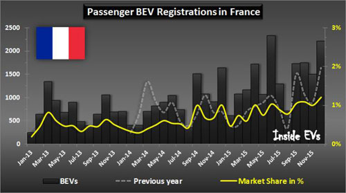 2015年12月份,純電動汽車銷量在法國創新高,銷量為3036輛(乘用車和輕型商用車)。 全年銷量增長47%,達到22187輛。其中乘用車 17268輛(增長64%)和輕型商用車4,919(增長10%)。 如果我們看一下乘用車,十二月帶來了1.21%的市場份額,創下了電動車的新紀錄。