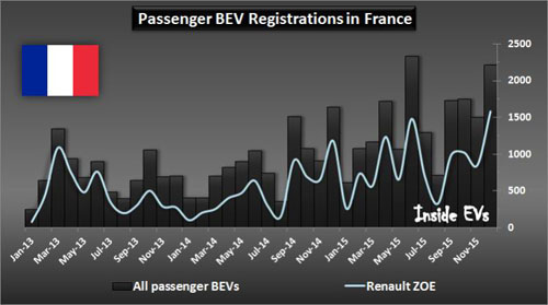 2015年12月份,純電動汽車銷量在法國創新高,銷量為3036輛(乘用車和輕型商用車)。