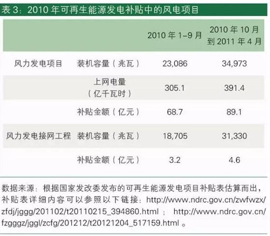 征收的電價附加能否滿足可再生能源電力補貼的需求呢?我們參照發改委發布的數據【4】來看。根據表2顯示,電價附加的主要補貼對象是可再生能源發電項目,接網費用占比很小,約為4.2%。在可再生能源發電項目中占比最多的是風電,因為在2010年,太陽能發電項目還非常少。依據表3,2010年1月-2011年4月,上網風電發電量達到696.5億千瓦時,補貼金額為157.8億元,占到同期可再生能源發電項目補貼額198.4億元的80%。