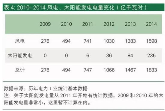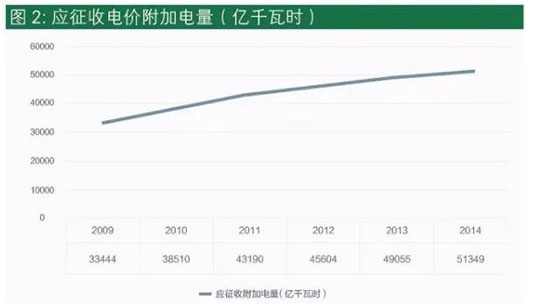 加速提升的電價附加征收標準反映出中國可再生能源發電的快速發展。根據電力企業聯合會的數據,風電發電量從2009年的276億千瓦時,增加到2014年的1598億千瓦時,五年時間增長接近五倍。