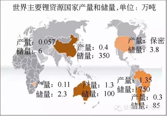 上圖展示了全球主要鋰資源國家分布、產量及儲量情況。